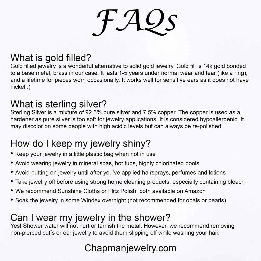 We strive to give you a worry-free buying experience! In the event of a defect or a broken piece, we offer a free replacement for our jewelry for 30 days. After that we offer 50% off of a replacement for up a year after sale.