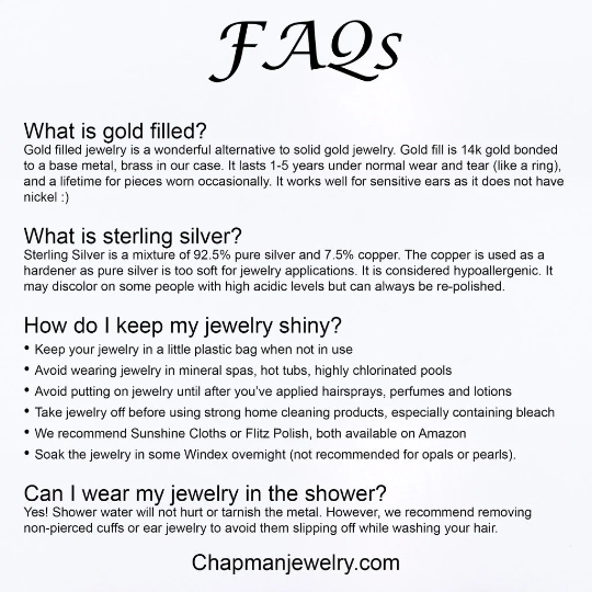 We strive to give you a worry-free buying experience! In the event of a defect or a broken piece, we offer a free replacement for our jewelry for 30 days. After that we offer 50% off of a replacement for up a year after sale.